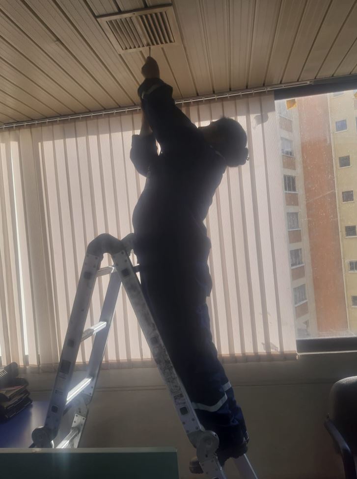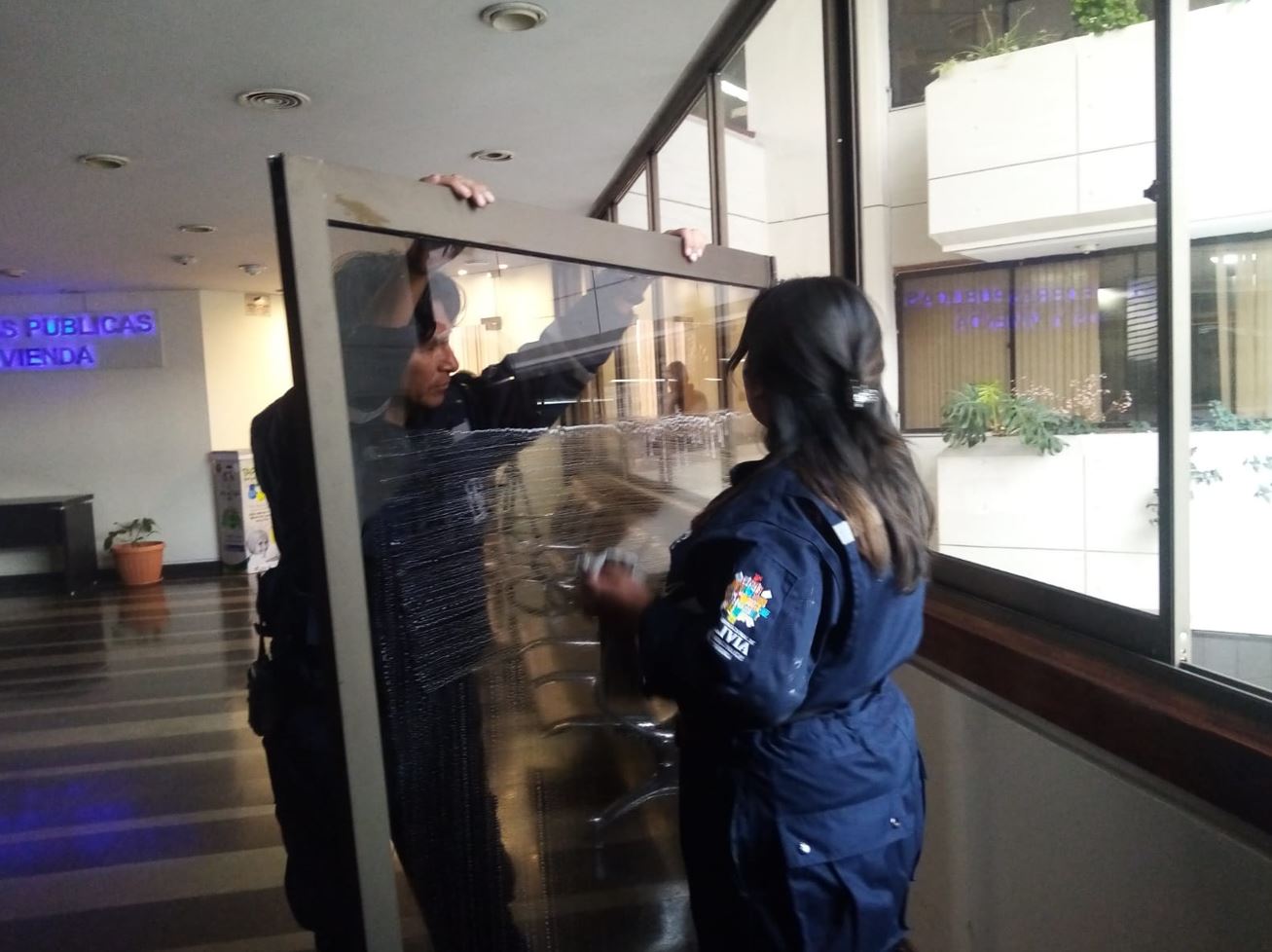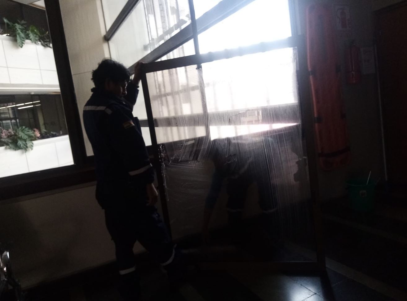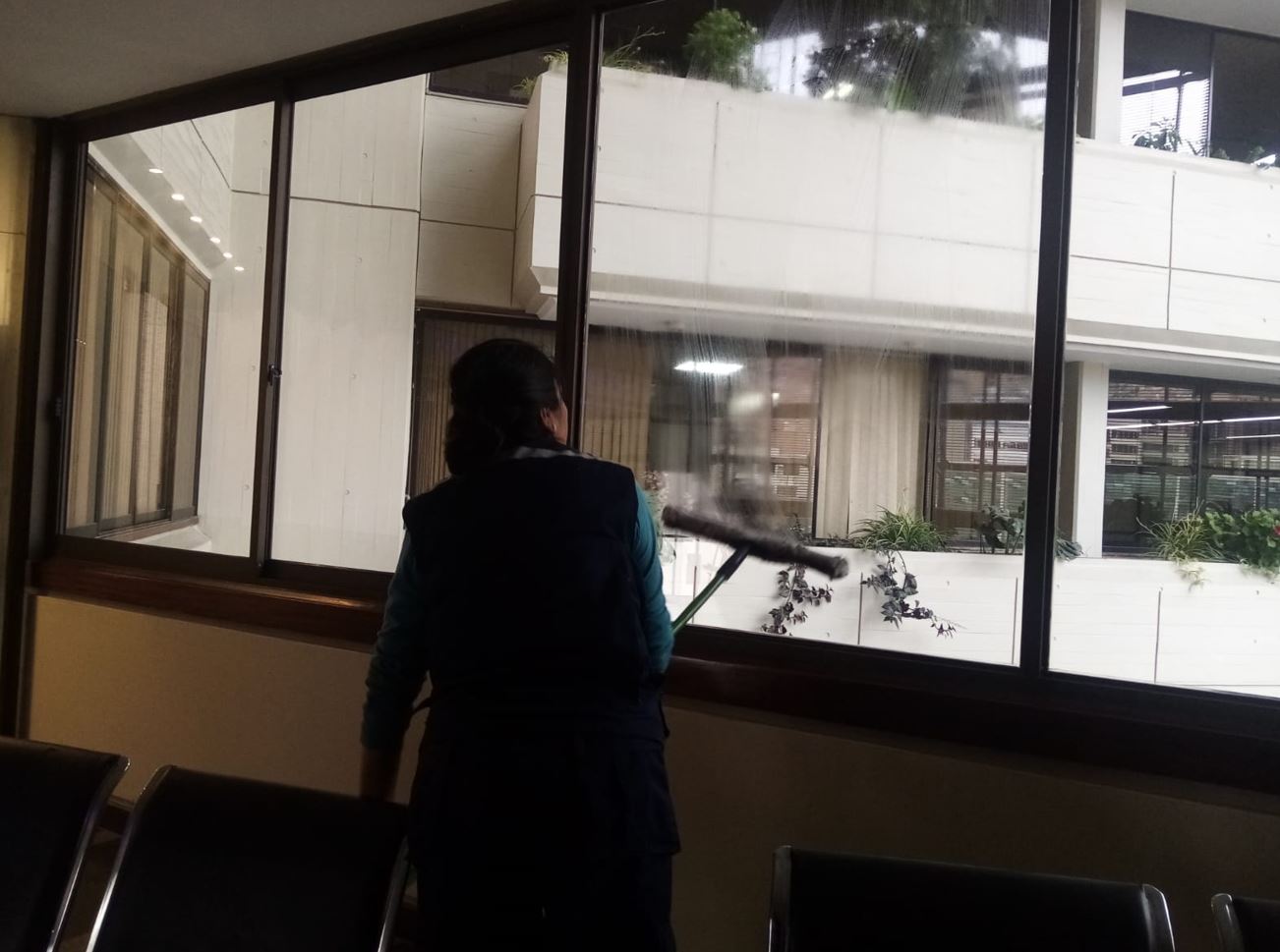 Personal de Serv. Gen. realiza limpieza de los vidrios en piso 5 del Edificio CCLP