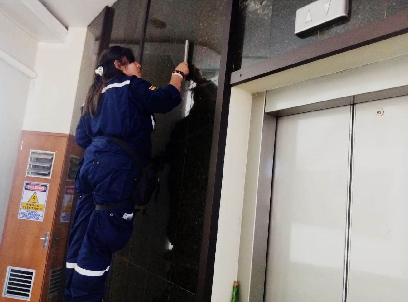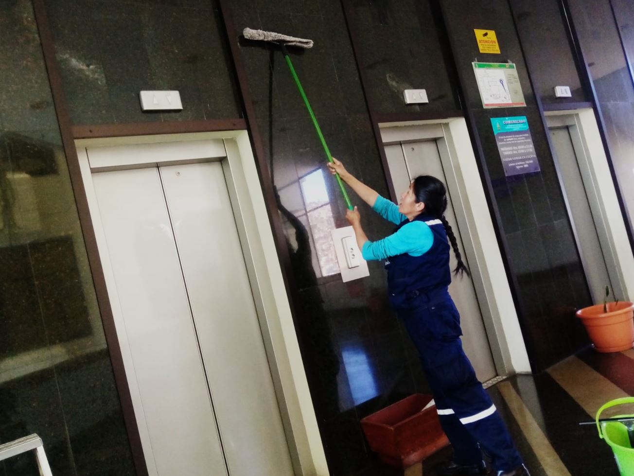 Personal de Servicios Generales realiza limpieza de mosaicos sector hall de ascensores del edificio CCLP.